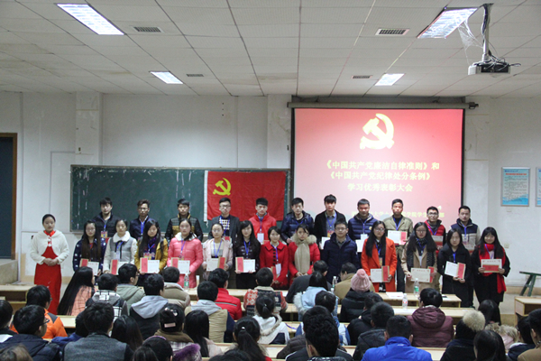 随后,召开的是优秀党员表彰大会。此次会议,是根据《中国共产党廉洁自律准则》及《中国共产党纪律处分条例》,对我院表现优秀的党员进行表彰奖励。该表彰大会的奖项分别是“优秀组织奖”和“优秀蹲点党员”。在会议主持人的名单宣读后,被表彰的各位党员分批上台,由易书记和曾老师亲自为他们颁发证书并合影留恋,希望他们再接再厉,为党效力,为人民服务。
