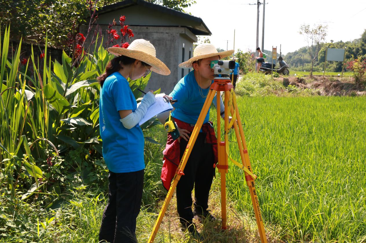 七月的烈阳、稻田旁的蚊虫、湿滑的小道等一系列的问题持续考验着队员们的毅力。但他们不畏困难,迎难而上,冷静分析,提出了合理的测绘方案。首先,团队选取观测点,然后架设好水准仪,进行观测。队员们发现稻田如果可以结合地形以及周边的河流,进行合理规划,将能够大大提高给排水效率,从而促进水稻产量的提升。