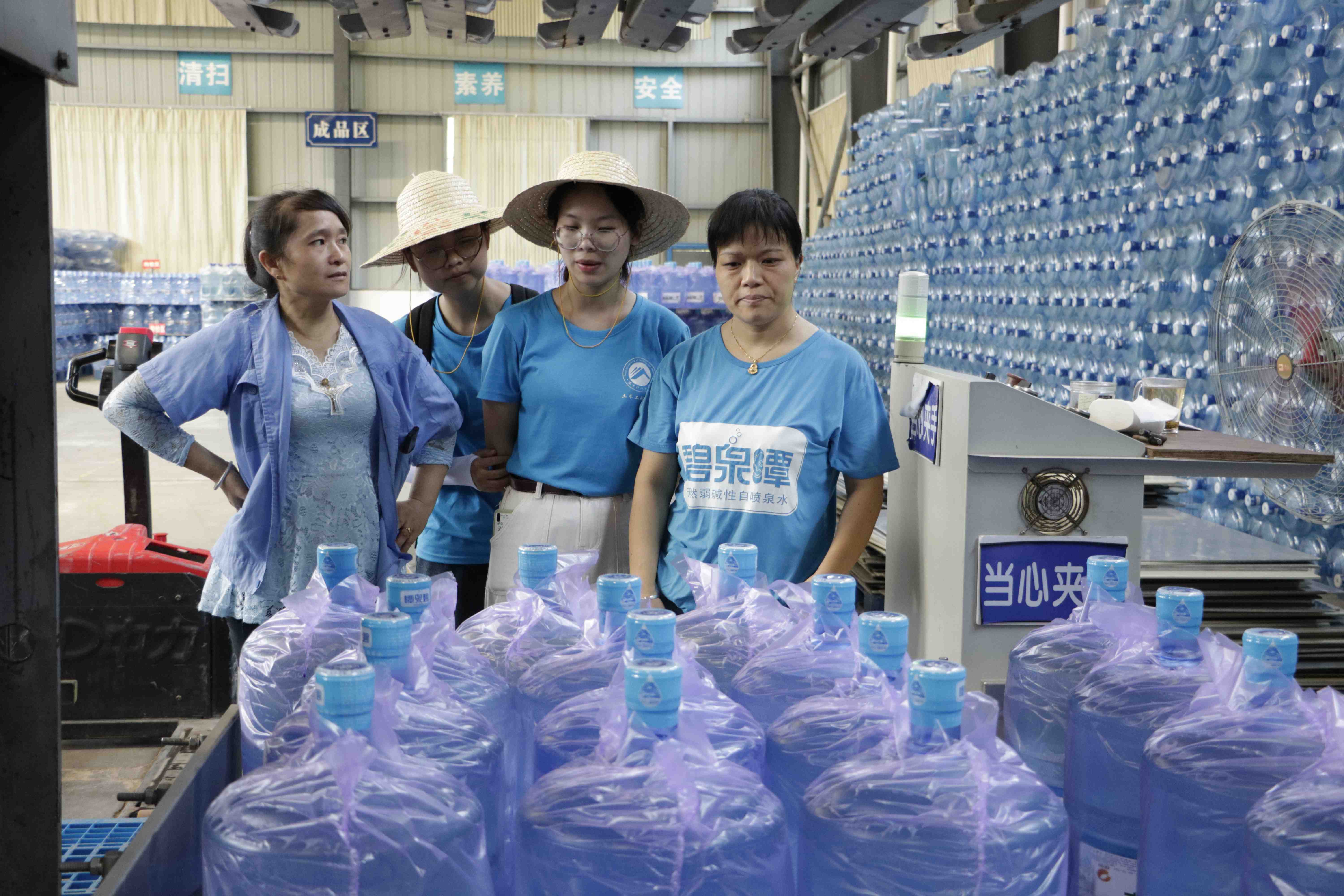 图为志愿者们在学习桶装水的基本生产流程。母慈悦 摄
