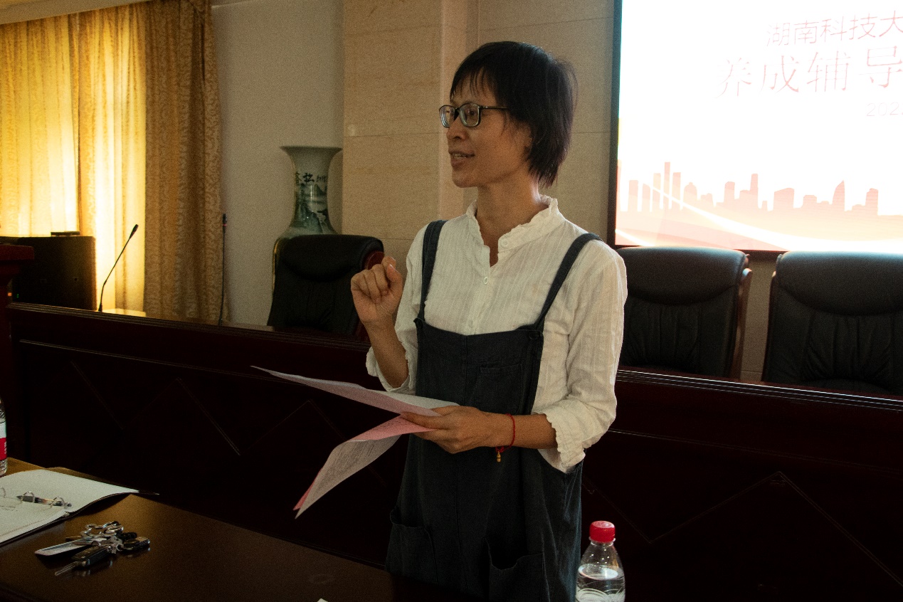 接着赵晓玲分享了她对养成教育辅导员的具体职责、角色定位和即将开展的新生养成教育工作的理解,其中最重要是要时刻清晰自己的身份定位,牢记自身的责任使命,努力做好新生适应工作和良好习惯的培养工作。她代表学院对各位养成教育辅导员寄予厚望,希望大家能够不忘初心,在为新生领路的同时也收获一个崭新的自己。