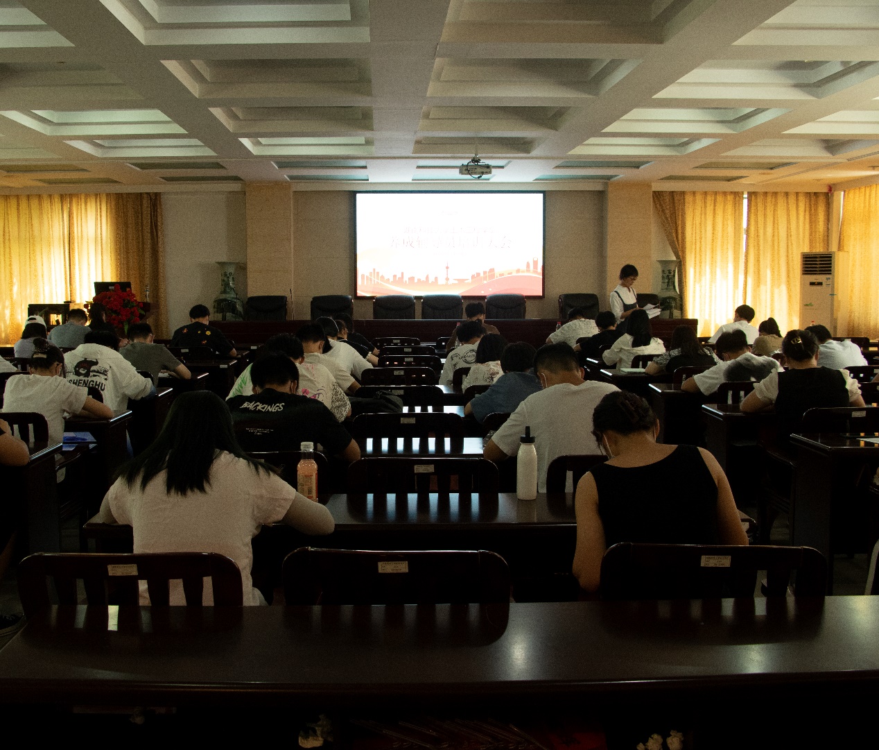 会议第一项,养成教育辅导员进行理论考试,辅导员老师和主席团成员担任监考官。养成辅导员这个职位在新生们的思想道德建设、班团建设、学风建设以及生活方面至关重要。养成教育辅导员们认真作答,审视自身的不足。