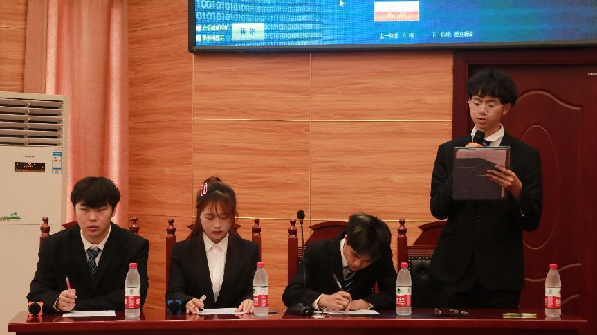 2023年5月“惟新杯”新生辩论赛决赛在立言楼3-2顺利举行。法管学院范军豪书记出席了本次比赛。该比赛评委由湖南工程学院高云青,湖南工业大学杨泳琪,湖南科技大学甘泽卉担任。