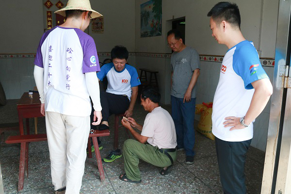 精感石没羽,岂云惮艰险。为了精准地测量出切坡的数据,志愿服务团登上陡坡,以最清楚的方式来进行测量。曾超峰在指导测量后从高处跳下不慎擦伤,附近的村民拿来了家中的碘酒,帮助他处理伤口。在前往目的地的途中,胡伟关切地询问杨成院村上的情况,如村上有多少户人、常驻人口有多少,每来到一位村民家中,胡伟都要与村民聊一聊有关切坡的生活问题,并提醒村民们注意安全。