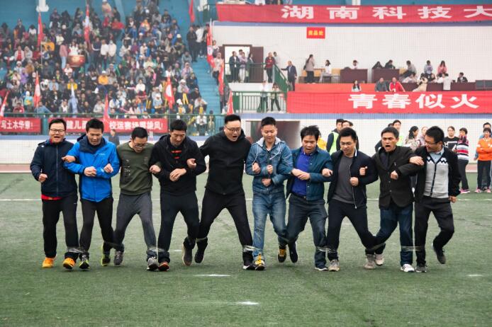 预备令之后,选手们一齐站在起跑线后,手挽着手,目光不约而同地注视前方,时刻准备着冲出。随着裁判洪亮的命令,所有教职工们默契地迈腿,整齐地喊着口号“一、二,一、二……”,伴着口号,有条不紊地向前迈进。步伐快速而划一。当选手们越过终点线的那一刻,运动场上再次响起了经久不息的掌声,庆祝他们获得了第一名的优异成绩。