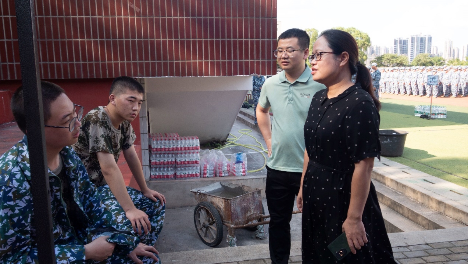 在烈日的炙烤下,一些新生出现了身体不适的情况,教官和值班学生干部及时将他们安排在阴凉处调整休息,并为他们贴心地准备了葡萄糖水、藿香正气水、饼干等物资。院党委书记万文、党委副书记陈笑、2023级辅导员谢春平、余晓铃也来到了训练场地,了解军训情况,询问、关心因身体不适在旁进行理论学习的学生情况,并对教官做出要求,务必在保障新生安全的基础上做好训练。
