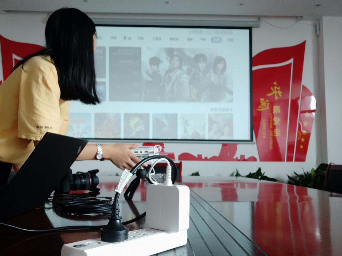 图为志愿者屈慧玲调试投影仪,为党课做准备