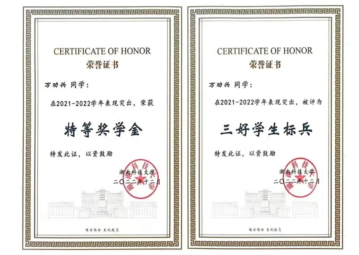 大学期间,万功兴学习成绩优异,平均学分绩点为3.92,连续三年学分绩均位于专业第一,英语四六级首考均为学院第一,已推免至深圳大学。他积极参与各类竞赛和各项活动,已获国家级奖项4项,省级奖项8项,校级奖励40余项;主要参与3项科研项目,已授权4项实用新型专利,见刊2篇论文。他乐于奉献,曾多次参与班级团活的黑板报布置,且连续两年担任学院分会副主席和班级学习委员;热心服务人民,积极参与各项社会实践志愿服务活动。