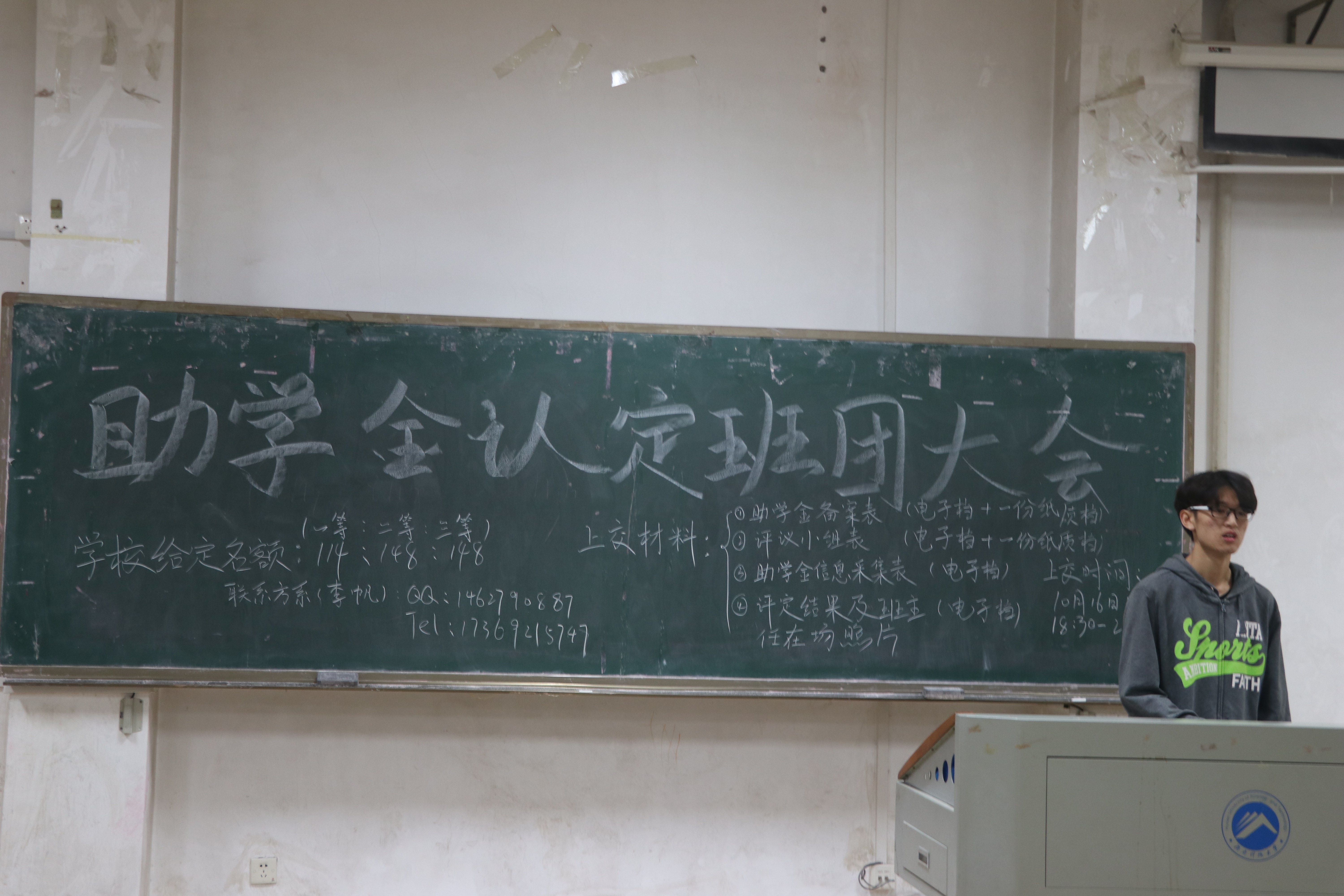 10月14日19:30,助学金班团认定大会在第五教学楼2-1召开,出席本次会议的有我院负责老师杨钋平,18级新生助班蹲点以及各年级各班班团。会议由勤工部部长李铭灿主持。