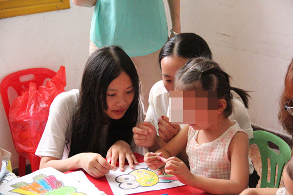 活动开始前志愿团负责人彭梓玉安排好三个负责人带队,以便工作有条不紊地展开。在志愿者们经历了酷暑中将近半个小时的车程到达自闭症儿童学校后,他们依然能很有耐心的对待每一项工作。学校里共有四间教室,分别用于自闭症儿童摆积木训练、画画训练、老师引导同学做游戏、自由做游戏。每一个教室里都有志愿者们陪孩子们开心玩耍的身影。有的志愿者教孩子们绘画;有的在教室里陪孩子们自由活动;有的带领孩子们配合老师做游戏。经过两个小时的相处,孩子们和志愿者们从刚开始的陌生渐渐变得熟悉起来。孩子们看志愿者们的目光也从胆怯慢慢的变成了欢快,很多孩子们甚至能给志愿者们一个大大地拥抱。