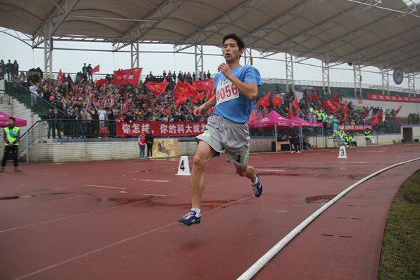 比赛开始前, 在赛道起点处,运动员们纷纷热身,为之后的奔跑做准备。1号跑道处,崔文治一边不断地活动着手腕,一边在原地小幅度跳动,同时还转动着脑袋,将全身预热一番。雨水打湿了他的脸庞,但他仍做着蹲踞式,像一张拉紧的弓,全神贯注地等待裁判发号施令。“各就各位,预备——!”听到口令后所有人的神经一紧, “碰!”一声枪响,所有选手如同一支支离弦之箭,飞奔而出。观众席上瞬时间也炸开了锅,纷纷为自己学院的选手加油。一时,呼喊声盖过了风雨声。全场的视线都聚焦在了选手身上,目光随着他们的前进而移动。奔跑中,崔文治瞪大眼睛,咬紧牙关,双手迅捷的前后摆动,两腿轻盈的飞速交替着,紧随前一位选手,一丝不落。最后,取得了全校第6的好成绩。