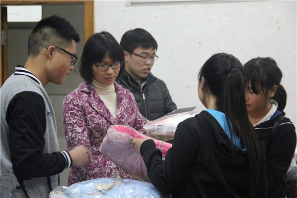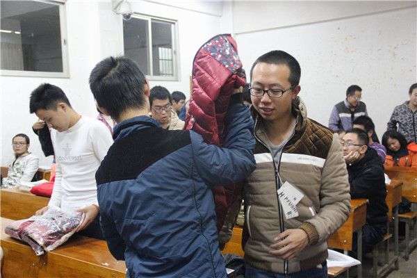 我院勤工部部长历灵聪主持发放仪式并指出说明——本次寒衣发放仪式的所有棉衣全是根据每位同学的身高所选购的。同时还考虑到了同学穿着的舒适度、棉衣的颜色、款式等因素,尽可能的让同学满意。接下来赵老师说道,她希望在场的所有的同学能够在这个感恩节记住社会和学院对他们的关爱,并以此为动力,发奋图强,加倍学习,努力争取奖学金,做最好的自己。