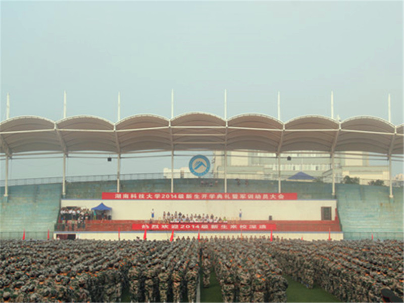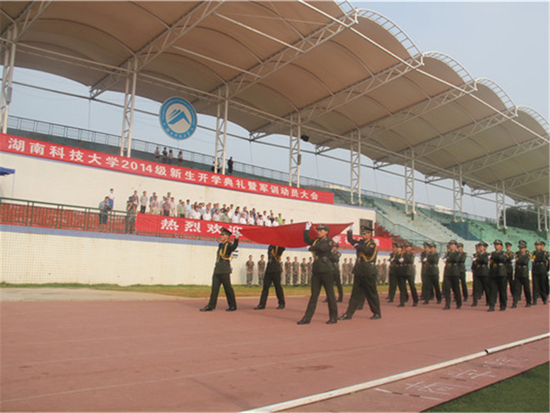 大会的第一项内容就是迎国旗。在全体老师及其新生面前,国旗班踢着整齐的步伐,喊着响亮的口号将国旗迎接至旗杆下。当国歌响起时,鲜艳的五星红旗在全体师生的注目下随着太阳一同冉冉升起。升旗仪式结束后,湖南科技大学校长刘德顺上台发言。他首先代表学校对新生的到来表示热烈欢迎和美好祝愿,向他们的父母、师长表达亲切问候和诚挚敬意,并从历史地位、办学条件、校园文化、社会声誉等四个方面对学校做了简要的介绍。