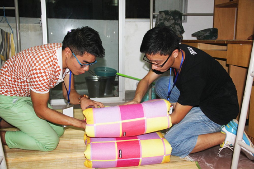 9月10日晚,新生军训的第二天,晚上的任务是整理内务,教官下寝教同学们叠被子。教官演示几遍后便让同学们自己练习,但是很多同学掌握的不是很好,所以我院的志愿者便手把手教新生叠被子。