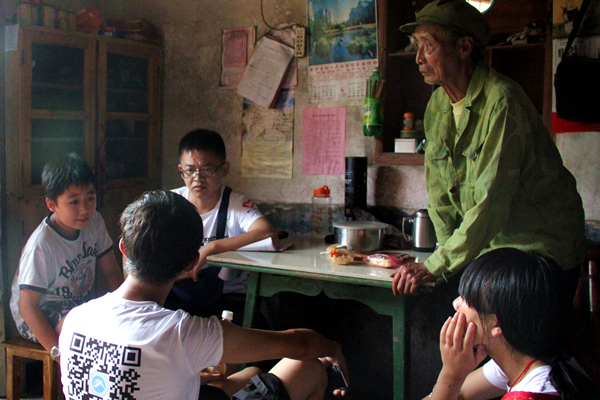 随后志愿者到山脚下一处老房子去探访。破败的围墙下,堆着满满的柴火和杂物,土墙上存留着厚厚的黑色烟熏痕迹。进入老房子,黄世伟的爷爷坐在光线黑暗的桌子旁,听说志愿者来了解黄世伟的基本生活情况,黄爷爷叹气地给我们说道:“这孩子苦呀!”。黄爷爷给志愿者说到,黄世伟之前一家在广东生活,去年因为爸爸因故去世后返回老家。现在他妈妈在增口乡一家制衣厂打工,他跟随爷爷一人生活,偶尔去陪妈妈生活。志愿者随后和黄世伟聊了聊,交代他一定要好好学习,在家里帮爷爷干些家务活。临走时,刘星老师资助了黄世伟一些钱,希望他能够健健康康的长大。