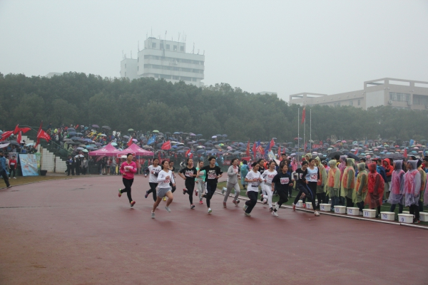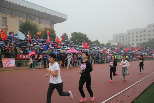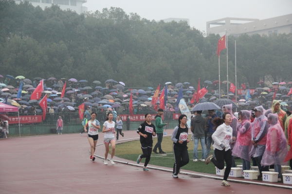 寒风阵阵袭来,风中夹杂着雨滴飘过每一位观众和运动员的身旁,为现场的热身为比赛做准备。随着裁判一声令下,穿着单薄的运动员们奋力地迎着雨奔跑在田径场上,在比赛中留下了她们坚强的背影。这时观众席上撑开的伞已经形成一片美丽的花海,正如奔跑中的选手们的心境一般美丽。选手们在雨中拼耐力,观众们在花海中为之助威,这一场景深深地感动了在场的所有人。赛后,每一位拼尽全力奔跑的选手都已精疲力竭,热心的志愿者们第一时间赶到她们身旁,给他们递热水,穿外套,搀扶着选手去一旁休息,她们忙并快乐着。在采访中大汗淋漓的傅沙和周骁涵都表示:“虽然成绩不太理想,但是重在参与”。