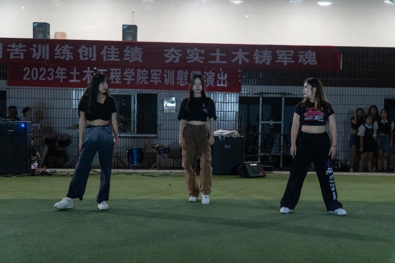 晚上,为丰富2023级新生的军训生活,点燃他们对大学生活的向往,缓解军训过程中的疲劳,由我院文体部组织的军训慰问演出在第三田径场主席台前火热开展。本次演出特邀学院舞蹈队、大学生信息安全队、D-Show街舞社等社团部门以及部分新生进行表演。全体教官及新生共同观看了本次演出。