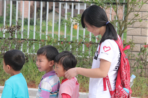 简单的交流之后,志愿者们和孩子们走到篮球场做起了游戏。在“老鹰捉小鸡”、“123木头人”和“丢手绢”等简单的游戏中,志愿者像孩子的哥哥姐姐一样关爱着他们。