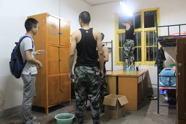 晚上9:30,在新生结束了严格训练的第一天后,我院各部门副部在团委学生会的统一分配下,到大一新生宿舍监督新生内务整理工作。此次对大一新生内务整理的指导工作主要包括:卫生间的污垢清理,宿舍物品的整理以及生活用品的规范摆放,玻璃的清洗等等。各位监督人员认真贯彻这些标准,不放过一个细节,从各方各面上对新生的内务整理进行监督。新生们也力求把宿舍卫生搞好,做到尽善尽美。他们不喊苦,不喊累,尽管汗水浸湿衣衫也一丝不苟地整理内务,不落下任何一个角落。新生吃苦耐劳的精神与积极上进的生活态度,在他们身上表现得淋漓尽致。
