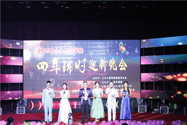 为迎接2015级新生的到来,展现土木学院学子风采,12月4日晚上7:00,由我院团委学生会文娱部承办的“四年锦时”迎新晚会在南校俱乐部隆重举行。我院党委副书记易贵元,学工办主任虢利钢,“就业爸爸”皇晓东,杨钋平,曾淑艳,刘星,赵晓玲,汪建群等老师出席了此次迎新晚会。