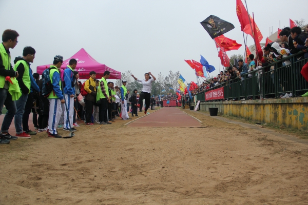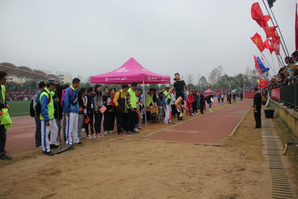 田径场上寒风肆虐,但现场气氛一片火热,各班班旗迎风飘扬,加油助威的口号声此起彼伏。随着裁判挥动手中的红旗,比赛正式开始。参赛选手们面色凝重,双眼坚定的注视着起跳线。此时,鼓手们不约而同的擂鼓,阵阵有力的敲打仿佛敲动着人心,现场气氛更加紧张和沉重。0078号选手李榕助跑、踏条、跳跃、坠地,一系列动作行云流水,宛如一道优美的弧线。而后的0096号选手陈境健也不甘落后,只见她用力的一跃,在沙坑留下美丽的脚印。赛后,她们表示:“虽然没有取得理想的成绩,但我们仍然会继续努力。”