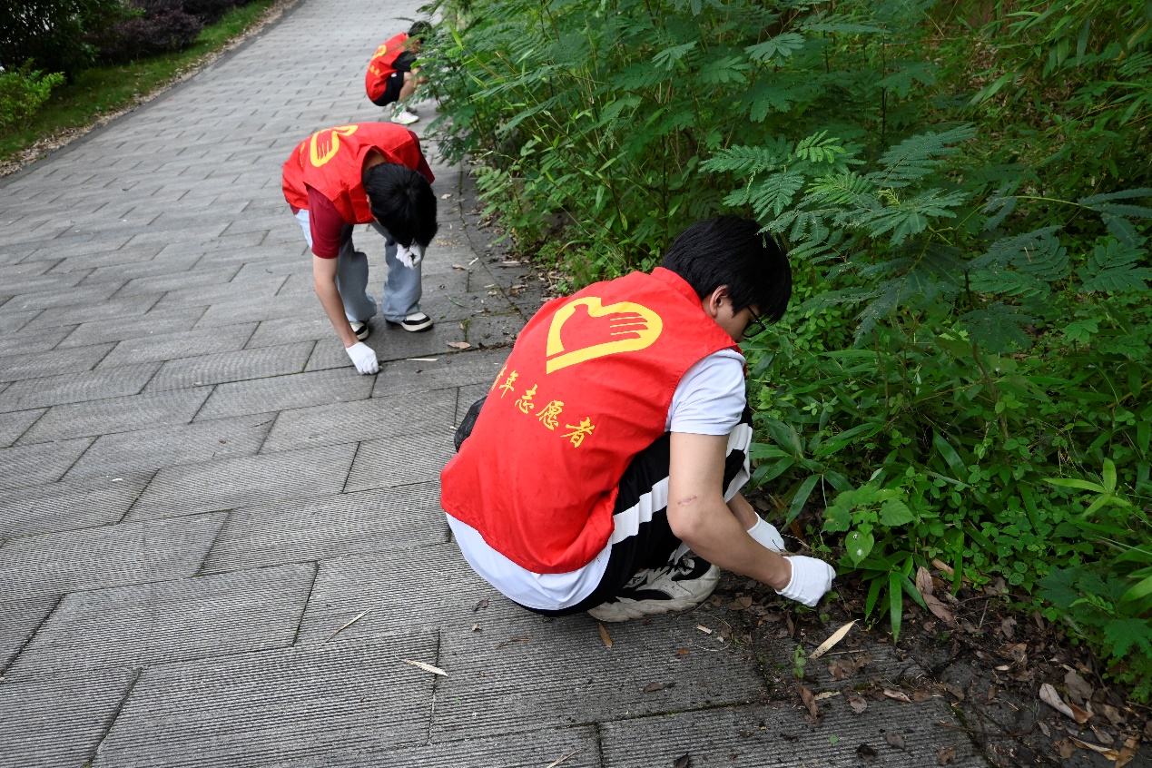 按照计划分工,志愿者们在松园、君桥至月湖桥干道周边绿化带投身到拔草护绿的行动当中。即便天下小雨,志愿者们仍一丝不苟。为美化环境,志愿者拔除杂草,清理路面。大家分工有序,团结合作,为校园的美好献出自己的一份力量。活动的展开不仅清洁了校园,还感召和带动学生志愿加入美好环境的保护当中,弘扬了学习生活中的实践劳动精神,促使学生在劳动实践中收获与成长。