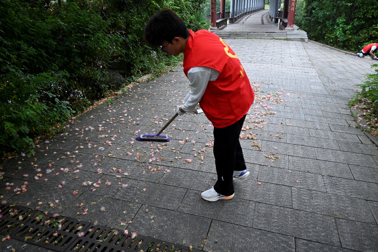 图为志愿者擦拭清凉亭下台阶。