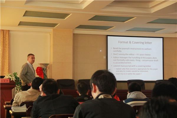 Andrew Hursthouse教授现任《Environmental Chemistry Letters(环境化学快报)》的副主编及英国和欧盟等国的基金评委,具有丰富的学术论文撰写、发表和基金申请经验。4月4日和4月9日上午,Hursthouse教授在土木学院会议室,分别以《Writing and Publishing in Science and Technology》和《Approaches to Research Funding》为题,与师生们进行了经验交流。他简明易懂地向我们说明,一篇好的论文应该使用简单词汇以避免读者难以理解,不仅要在表达上做到清晰易懂,更要注重用强有力的证据去支撑自己的观点。他还指出,“You may develop a conceptual story and that make a very nice song!”“Academic research should be fun!”