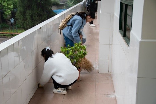 在卫生打扫过程中,各组分工明确,井然有序,成员干劲十足,发扬“不怕脏、不怕累”精神,积极参与实践活动,她们拎着水桶,拿着扫帚、抹布走进教职工宿舍楼梯间清扫垃圾杂物、清除卫生死角、擦洗楼梯护栏,全覆盖大清扫,热火朝天、马不停蹄地忙碌着。有的清扫散落的枯叶和草丛绿化带的杂草,有的弯腰捡拾路上的的垃圾;有的蹲在地上用钢丝球擦洗地上的污垢;有的用洗衣粉拖洗地面;有的清理积水、清洗纱窗。大家团结协作,完成自身工作的同时,积极主动去帮助他人,充分展现了共产党员与入党积极分子、发展对象等吃苦耐劳、团结友爱的精神品质。