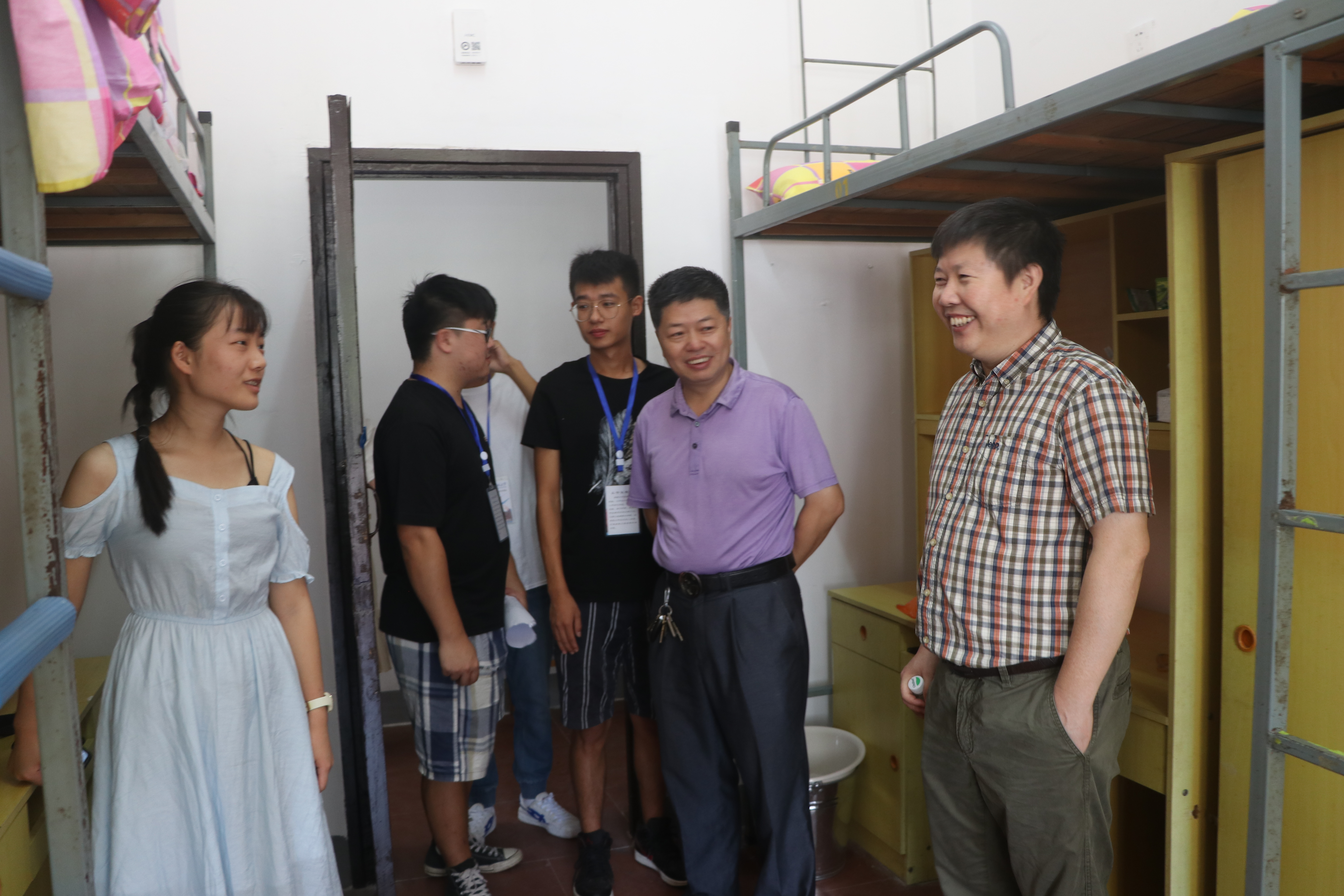 首先,祝院长和程书记等一行人去了4区女生寝室。由于今年我院女生人数增多,所以18级女生被安排住在原来只住男生的4区,因此,考虑到女生的安全问题,学院已经给女生各个寝室装好了窗帘并提到会尽快解决门禁问题。女生宿舍大都干净整洁,祝院长和程书记俯身亲切询问她们是否满意宿舍条件并亲自帮她们检查宿舍基本设施。其间,祝院长和程书记还碰上了因为不舍仍在宿舍的新生父母,他们交谈甚欢,家长们也表示对学校和宿舍都很满意。