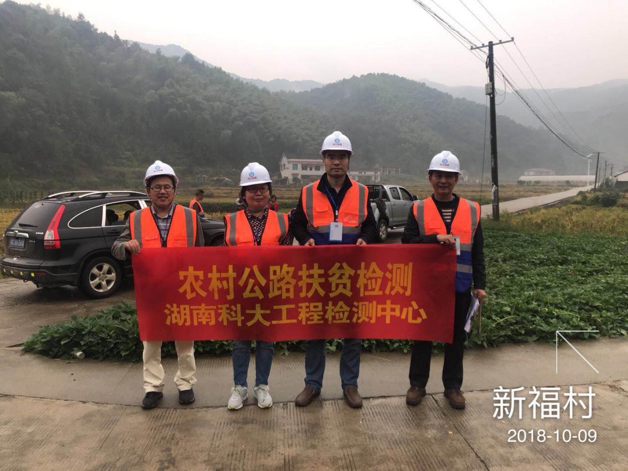 2018年10月9日~2018年10月12日,米乐官网米乐mile官方网站工程检测中心积极响应交通运输部办公厅《关于开展农村公路扶贫公路建设质量安全检测志愿帮扶工作的通知》(交办安监函〔2018〕1317号)的有关要求,参与我省农村公路、扶贫公路志愿帮扶检测工作。此次扶贫工作由米乐mile官方网站党委书记陈秋南(教授、检测工程师)亲自带队,参加现场检测人员有:院工会主席孙洪鑫副院长、检测中心副主任崔翠微、检测工程师贺建清、沈明燕、黄向红、欧阳国锋,参加室内检测人员有:检测中心副主任聂忆华、检测工程师曹国娥。检测工作全程有平江县交通质监站工作人员监督见证,施工单位及各乡镇工作人员陪同引路。顺利完成了24条、共计34.4km长的岳阳市平江县脱贫攻坚自然村通水泥路厚度及强度的检测工作。