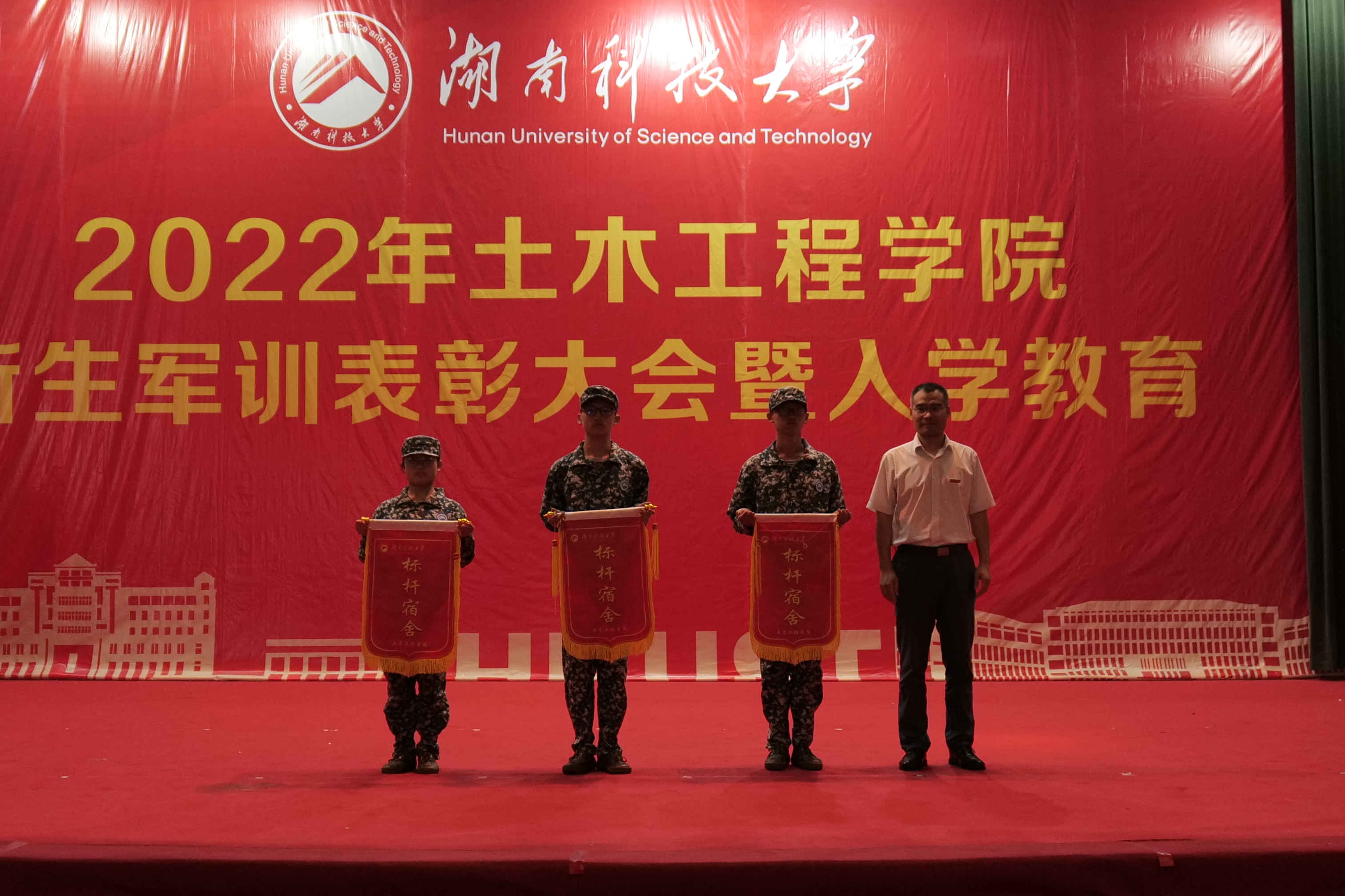 活动的第二阶段是军训表彰。伊始,祝明桥宣读2022级军训表彰文件。接着,依次颁发军训“标杆宿舍”奖、军训“优秀宿舍”奖、军训“先进个人”奖,颁奖嘉宾和获奖者合影留念。团委学生会主席团及各部门部长演唱《土木欢迎你》,祝贺新生军训善始善终,完成大学的第一道考验。