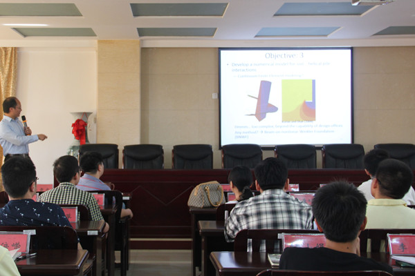 报告会议由我院党委书记祝明桥主持。首先,邓丽军博士作出他在新加坡关于螺旋桩的报告。他目前主要的研究方向包括:1)桩土相互作用。2)转动浅基础。3)油砂尾矿的处理。并引用了实验中的例子加以说明他实验的成果。另外,他还为有意向出国的同学提供了珍贵的意见和相关方面要做的的心理准备。
