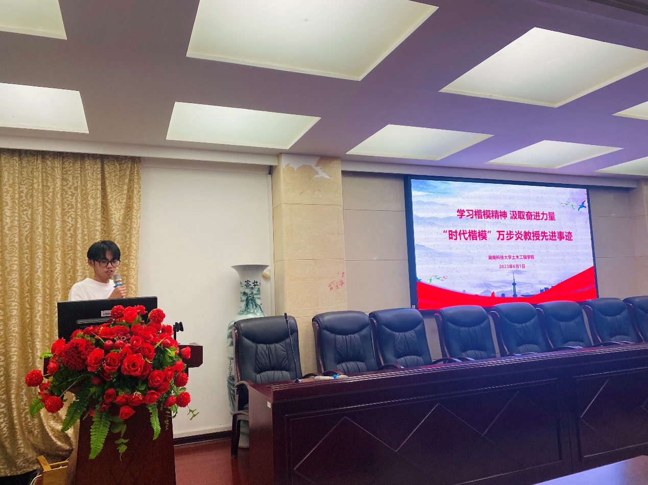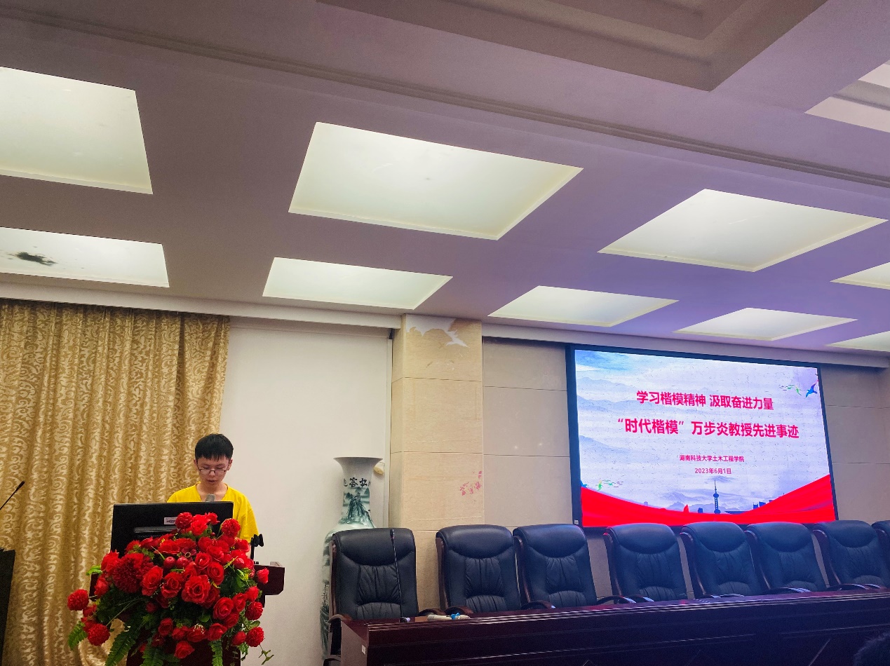 潘宇麟同学表示万步炎同志的精神品质是我们学习的楷模,他始终保持着乐观向上的态度,无论遇到什么困难和挫折,他总是以一个平常心对待,勇敢面对并积极解决。他对待每一位学生,也都充满了关心和耐心,用自己的真诚和温暖感染着每一个人。他的正直和诚实,深深地打动了我们的心。万步炎同志的杰出成就和荣誉,是我们学习的榜样,他多次荣获国家级奖项和荣誉称号,却从不骄傲自满,而是更加努力地工作和学习,不断提高自己的专业水平和教学质量。