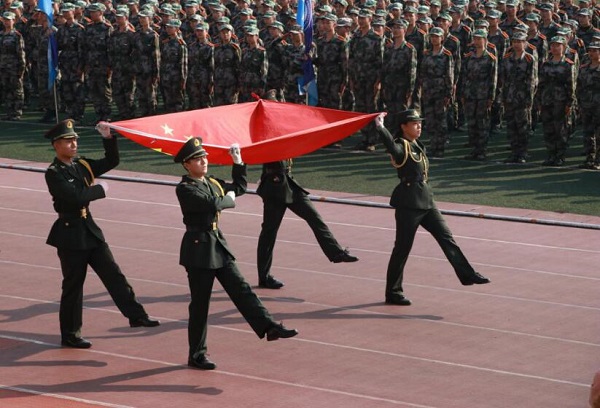 当雄壮的《义勇军进行曲》奏响,国旗仪仗队手捧国旗,迈着整齐的步伐向升旗台前进,此时此刻全体起立,所有人的眼光追逐着五星红旗。伴随着五星红旗徐徐上升,此次军训汇演大会就此拉开帷幕。雄赳赳,气昂昂,迈着矫健的步伐,喊着整齐响亮的口号,我院方阵队将最优秀的一面尽数展现出来。十四天的刻苦训练,十四天的风吹雨淋,此刻都化为骄傲。