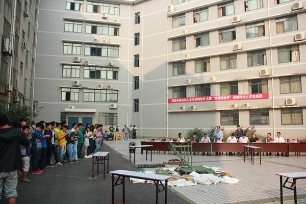 为了考察学生运用专业知识做出合理、经济的多层房屋结构模型的能力,使学生获得关于提高结构抗侧移和抗扭转能力的基本概念,并且在校内选拔出优秀学生参加湖南省结构设计大赛。10月24日上午八点,由我院主办的湖南省第四届大学生结构设计大赛湖南科技大学选拔赛在土木楼拉开序幕。院党委副书记易贵元,教务处长陈秋南,教务办主任罗小红,专家组组长刘锡军以及李永贵,周游,沈明燕,马滨辉,汪建群等老师出席了本次大赛。