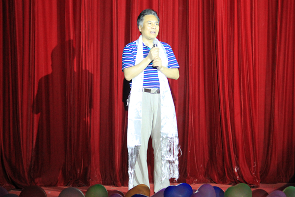开场舞过后,学工处处长李红革上台致辞,一名藏族同学上前向他献上了洁白的哈达以表达最诚挚的祝福。首先他表达了对准备晚会的藏族同学们的感谢,然后他表示,在筹备第二次党代会期间举办这类晚会意义十分重大并预祝此次晚会取得圆满成功,最后他代表学校赞助两千块作为晚会所需费用。