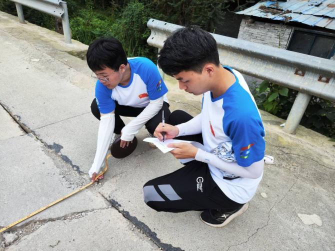 实践团通过对山阳村公路灾害的现场调查,发现部分公路路面存在裂缝,影响了村民出行和交通安全。为帮助学生更好理解和掌握公路灾害的形成机理和特征分析,任中俊老师和张宗堂老师对实践团进行详细指导。张宗堂老师讲解到:“在部分路段道路两侧存在水沟,使得道路路基发生了渗流现象和不均匀的沉降,导致路面应力超过承载能力,从而产生了裂缝。”实践团使用皮尺对路面裂缝进行准确的测量,并记录数据。经过现场分析,沉降的原因可能与地质条件、地下水位、土壤性质、施工质量等因素有关。