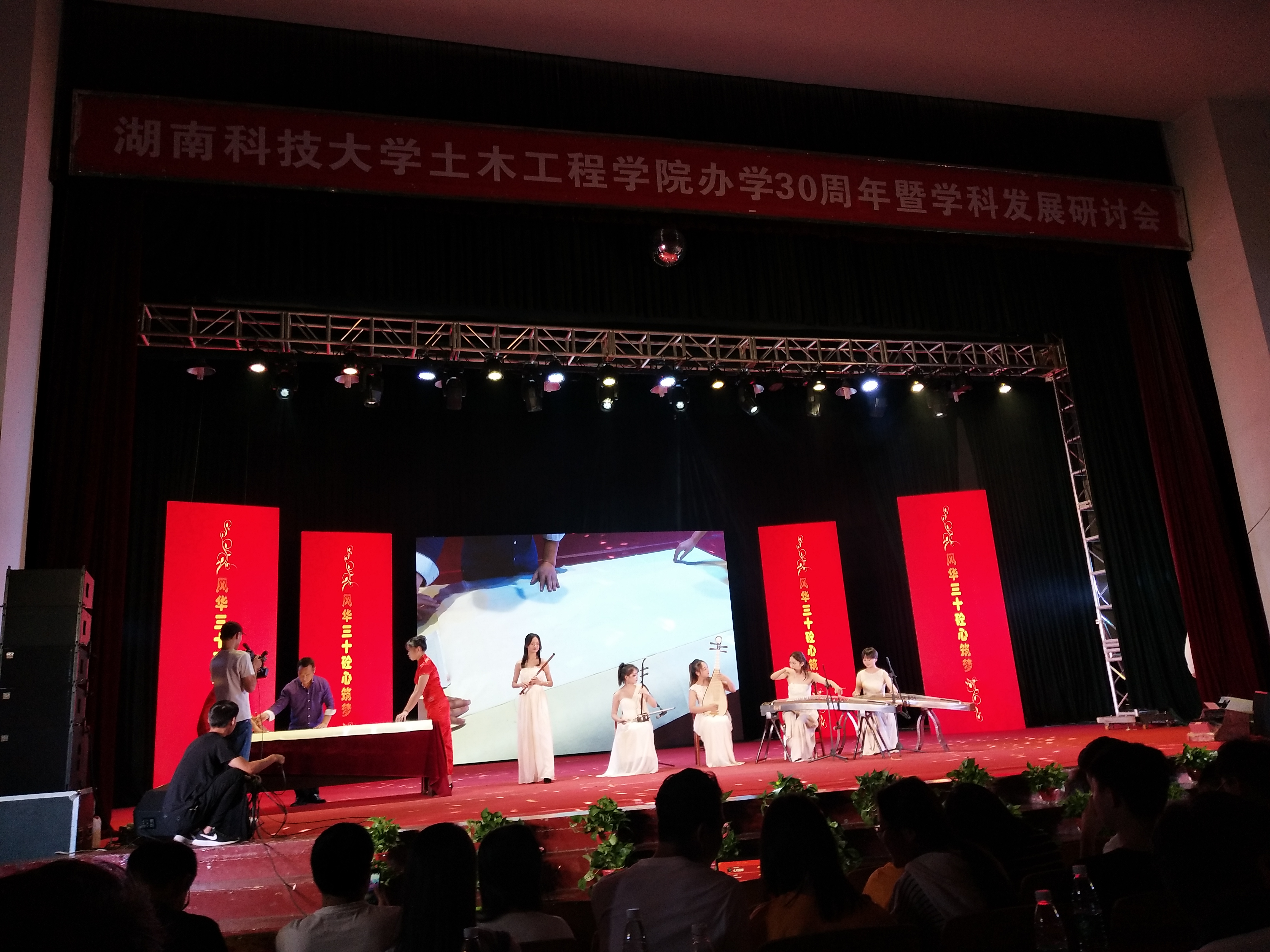 其间现场的节目精彩纷呈,不仅有歌曲演绎、器乐表演;还有动人的舞蹈、有趣的情景剧、抑扬顿挫的诗朗诵......首先,艺术学院带来了“萧、二胡、琵琶、古筝、古琴”五器合奏的《金蛇狂舞》使现场的氛围更加欢乐,并在悠扬的《莲湖谣》中为土木学院送上现场书法——“砼心筑梦”,祝贺土木学院30周年院庆。之后,湘潭市二中的同学们用激奋的鼓点配乐,跳了一场大气磅礴的中国古典舞,给现场观众带来一场视听盛宴。16级建筑工程专业的张文馨说:“我对这个中国舞的印象最为深刻,很有精气神!”