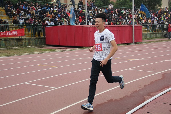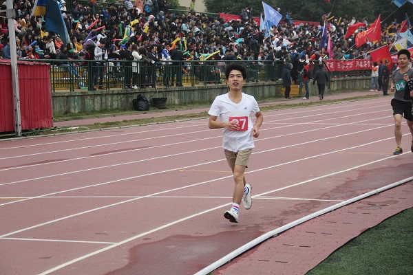 当女子组结束比赛时,男子组也做好了检录工作。代表我院参赛的有谭杰元、莫蔚。在采访中,谭杰元表示此次比赛他心里一点也不紧张,他说:“低调生活,重在参与,也为了自己追求目标而奔跑。”当被问到为什么参加比赛时,他不假思索地道:“对跑步的热爱!” 长跑比赛过程中,谭杰元和莫蔚不断调整自己的呼吸,控制着自己的节奏,在最后冲线的一百米跑道上,他们拼命调动全身力量,超越了前方已经无力加速的选手,完美展现了我院顽强拼搏,坚持奋斗的精神面貌。