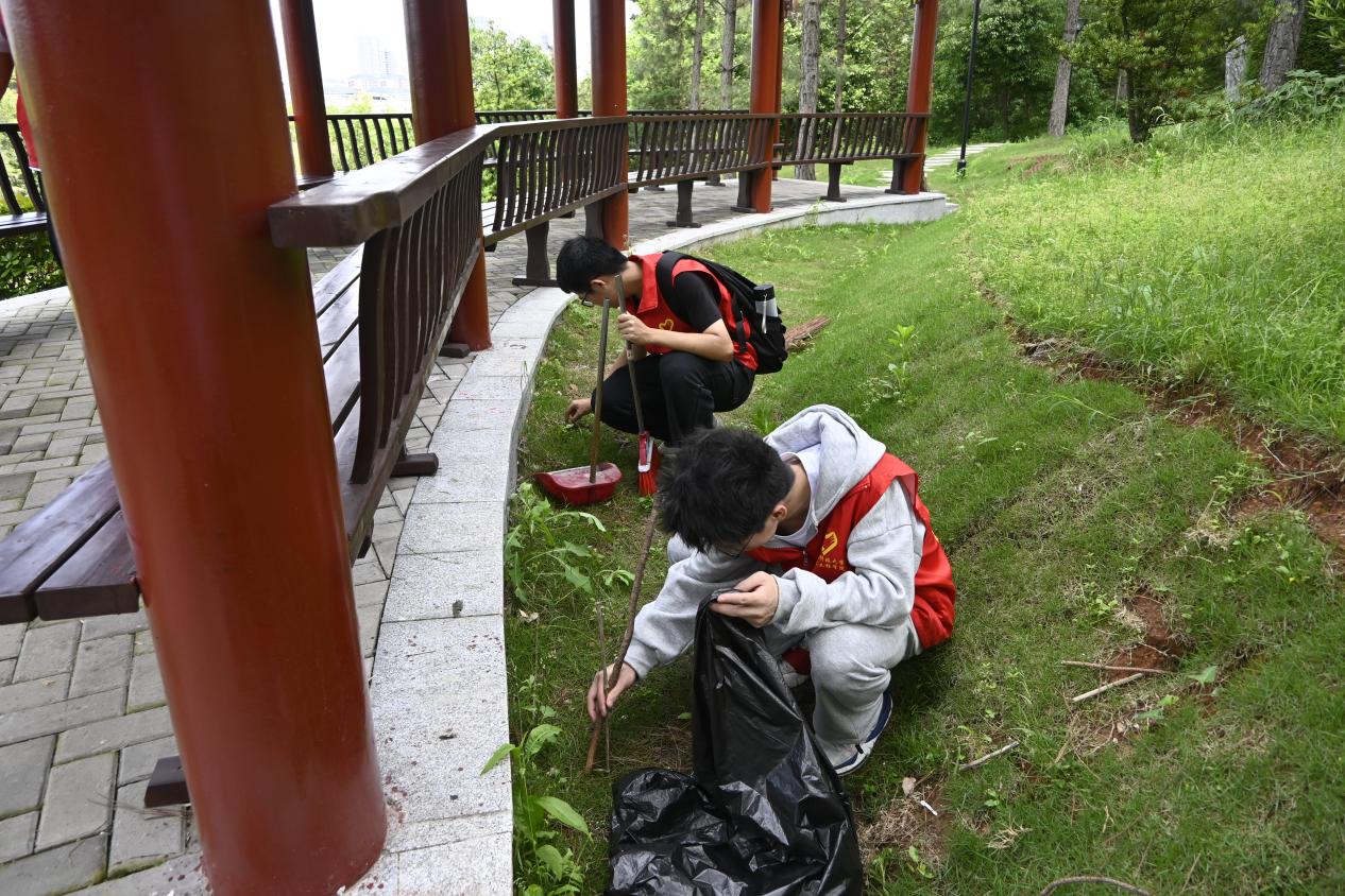 图为志愿者认真清扫凉亭边的垃圾,为营造一个良好的环境做出贡献。