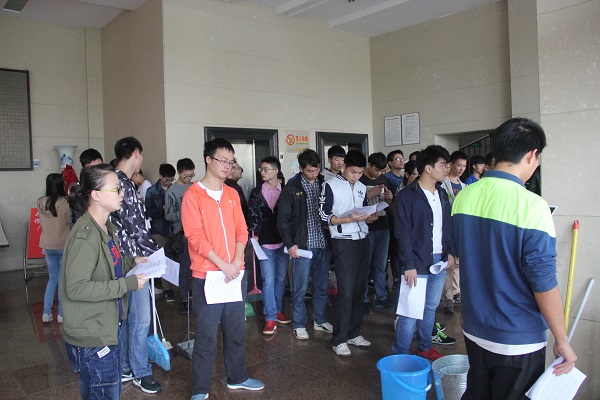 在五教前的篮球场集合完毕后,积极分子分组由各负责蹲点带到指定的区域,打扫卫生正式开始。实践活动中他们工作认真,充分发扬了入党积极分子吃苦耐劳的精神品质。面对巨大的工作量,他们主动分工,每个人的任务十分明确。不管任务轻重,他们都积极完成,因为他们的目的只有一个——高质量高效率的完成所有工作。他们反反复复检查每一个细节位置,一遍遍打扫,争取将最好的成果交到蹲点党员面前检查。积极分子们不怕脏不怕累,用自己的辛勤劳动换来干净整洁的土木楼。
