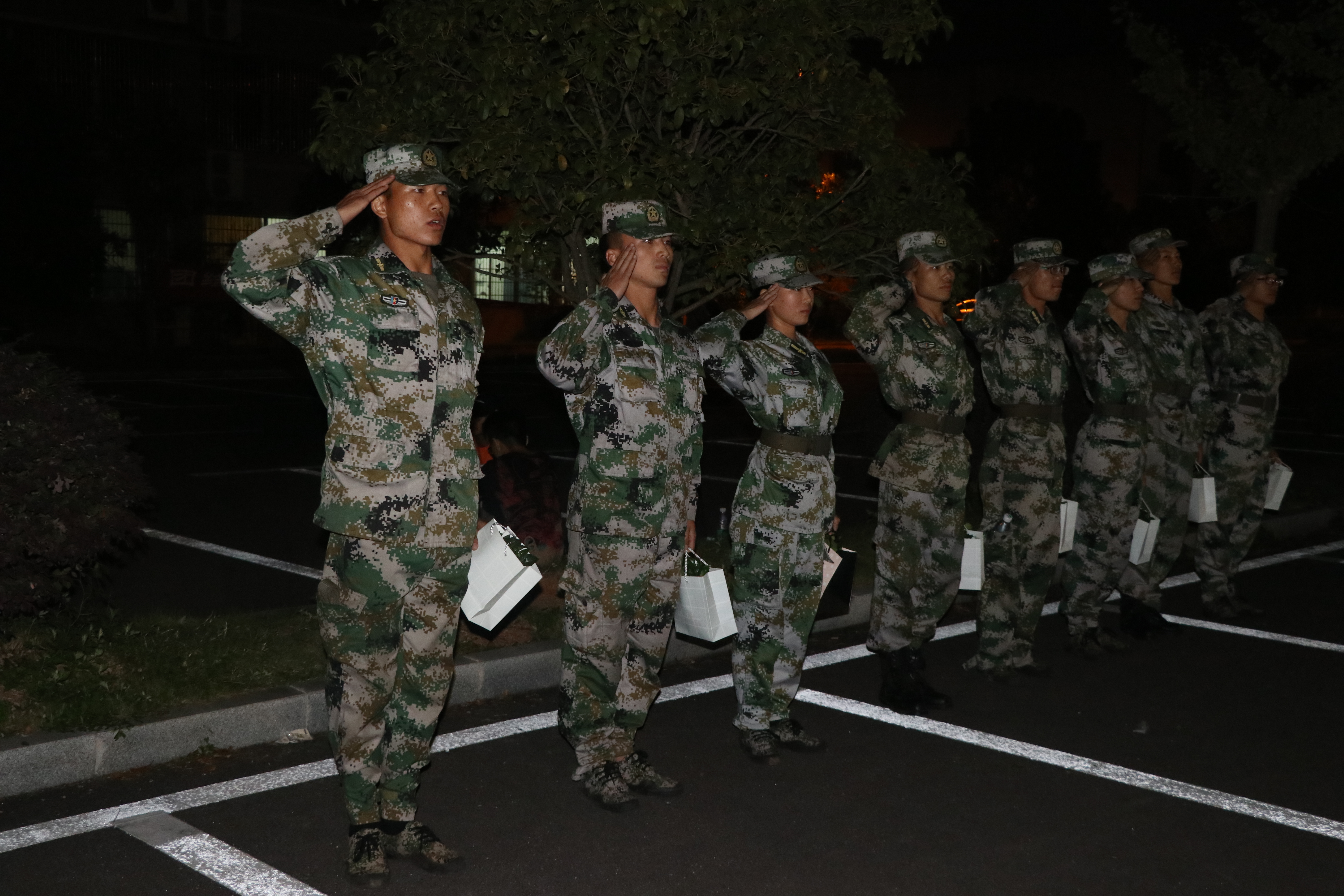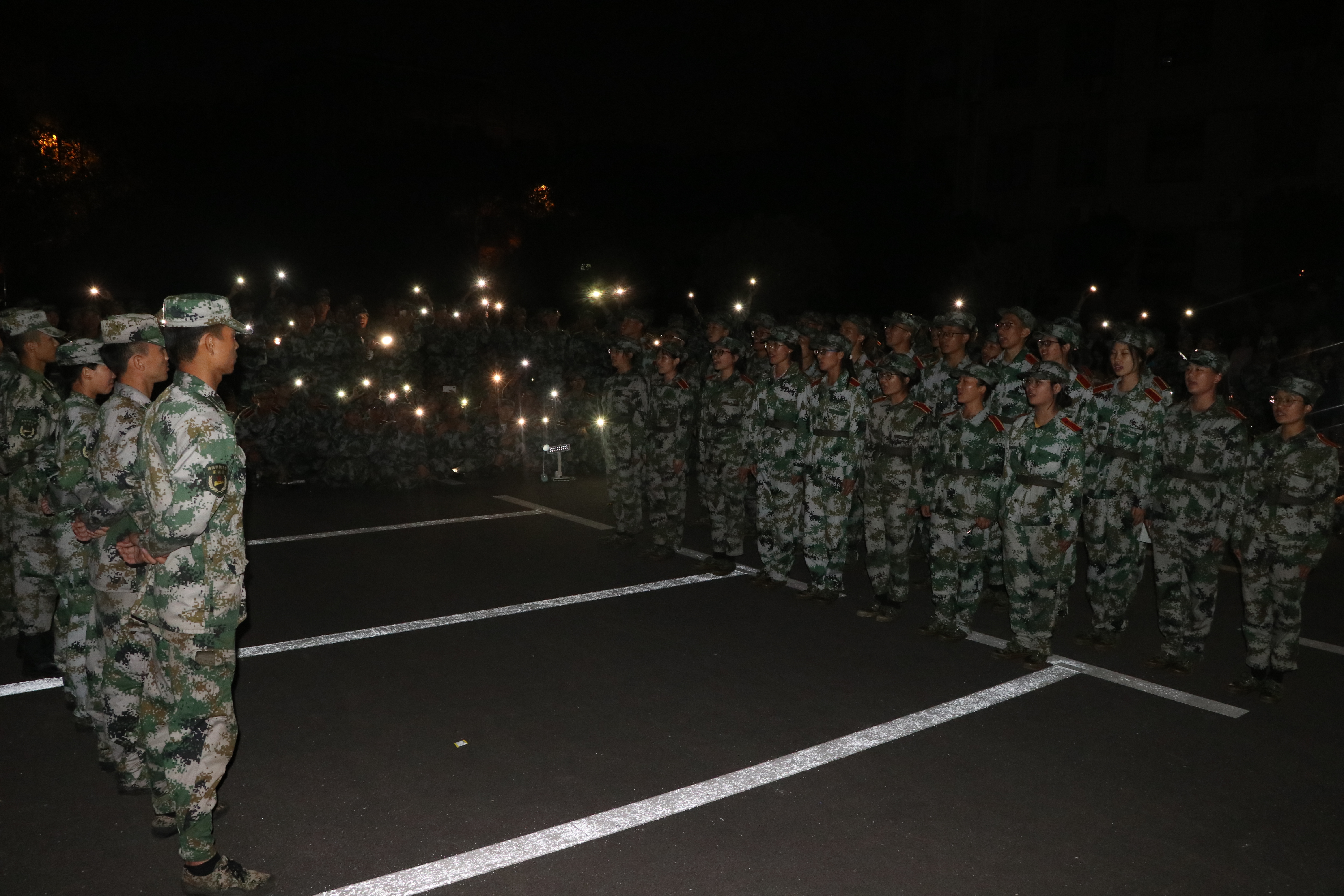 在汇演结尾,全部由新生组建的合唱队为教官们歌唱,献上了自己感恩的心。歌声浮动,灯光摇曳,他们感谢教官们这十二个日日夜夜的陪伴。十二次风风雨雨,他们从雏鹰长成了奋击长空的勇士。