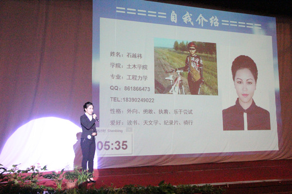 大赛在活力四射、精彩万分的开场片中拉开序幕。之后 十位选手分别上台和我们分享他们的职业规划,我院代表石越祎,她以美丽优雅的形象,自信阳光的演讲征服了评委和观众。坚定信念,永不退缩正是她努力的宣言。她说到,希望自己强化专业技能和英语能力,成为一名优秀的工程论文作译者。其外,还有明锐自信的的法学院代表向鹏荻分享了他的律师梦,沉稳大气的机电工程学院代表赵鹏程分享了他的CEO梦,其他学院的选手也热情洋溢的介绍了自己的职业规划,现场气氛非常活跃,雷鸣般的掌声此起彼伏。