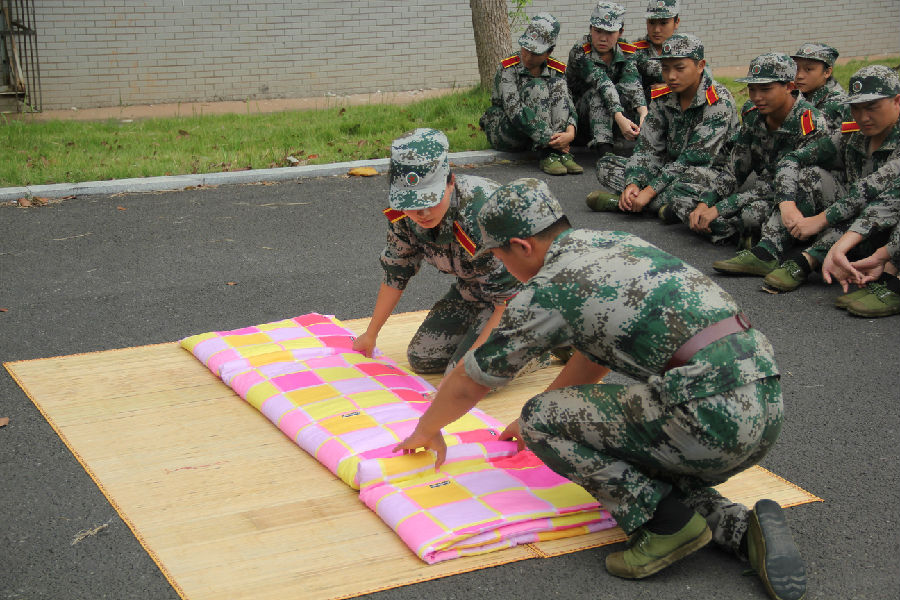 叠被子是军训中的一门课程,是内务整理难度较大的一项内容。通过叠被子的学习,不仅让学生对军队内务整理有了深刻的了解,也学到了内务整理的技巧,培养了同学们良好的生活行为习惯。更重要的是从中学到了军人严于律己、一丝不苟的优良作风。