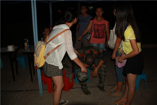 在晚训中,服务台的学生干部们随时待命,在军训场地值班。我院学生会主席胡海林更是在新生们表现不佳时,为他们加油打气,以自己的亲身经历来勉励同学们。而在同学们倒下时,总有那么些学长学姐采取应急措施,为他们递水扇风,安抚聊天,在细节处给予其最大关怀,使新生们在军训中不仅体会到了汗水与成长,也感受到了来自土木学院大家庭的温暖。还有一直守候新生军训的助班和蹲点们,也都给予新生们最大的鼓励与帮助。